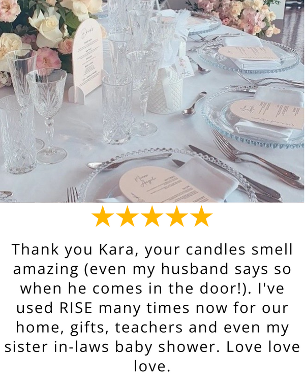 For the past few years Kara at Rise The Candle Studio has been supplying branded candles to our company. They are beautifully presented in a black and white gift box, and our clients are always delighted when they receive this gift. Kara is a pleasure to deal with and is very responsive to our requests for additional candles. Our experience has always been wonderful.